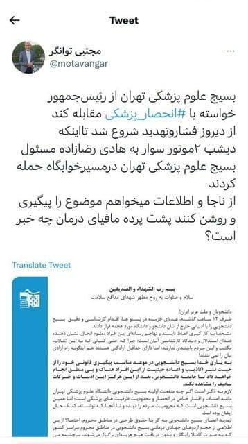 در همین راستا مجتبی توانگر نماینده مردم تهران در توئیتی ضمن انتشار خبر حمله به مسئول بسیج دانشجویی دانشگاه علوم پزشکی، این اقدام را احتمالا به دلیل ارسال نامه این تشکل به رئیس جمهور برای مقابله با انحصار پزشکی دانسته و از نهادهای انتظامی و امنیتی خواسته موضوع را پیگیری و روشن کنند تا مشخص شود پشت پرده مافیای درمان چه خبر است؟