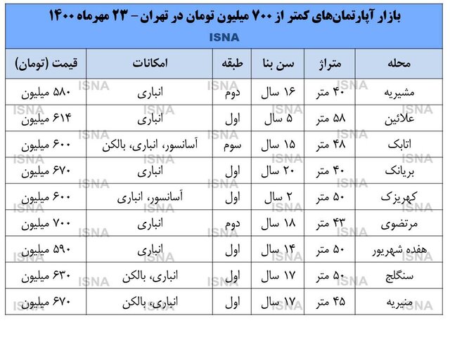 با توجه به میانگین ۳۱.۶ میلیون تومان قیمت هر متر خانه در تهران طبق معاملات مهرماه ۱۴۰۰ یک آپارتمان ۵۰ متری در پایتخت به طور متوسط حدود ۱.۵ میلیارد تومان ارزش دارد. بنابراین واضح است که در مناطق شمالی و حتی میانی تهران نمیتوان با نقدینگی حدود ۷۰۰ میلیون تومان خانهدار شد و باید به سراغ محلههای جنوبی رفت. البته در این محلهها نیز واحدهای نوساز با نرخهای میلیاردی عرضه میشوند و اکثر خانههای در محدوده قیمتی ۷۰۰ تا ۸۰۰ میلیون تومان را واحدهای بالای ۱۰ سال تشکیل میدهند.
