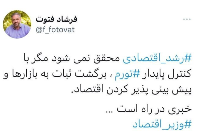 به گزارش الف فرشاد فتوت در حساب کاربری خود در توییتر فضای مجازی نوشته است: رشد اقتصادی محقق نمی شود مگر با کنترل پایدار تورم، برگشت ثبات به بازارها و پیش بینی پذیرکردن اقتصاد. خبری در راه است...