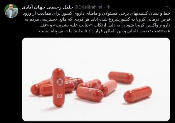 «خط و نشان کشیدن های برخی مسئولان و مافیای داروی کشور برای ممانعت از ورود قرص درمانی کرونا به کشور شروع شده! باید هر فردی که مانع دسترسی مردم به دارو و واکسن کرونا شود را به دلیل ارتکاب «جنایت علیه بشریت» و «قتل عمد»تحت تعقیب داخلی و بین المللی قرار داد تا بدانند ملت بی پناه نیست.»