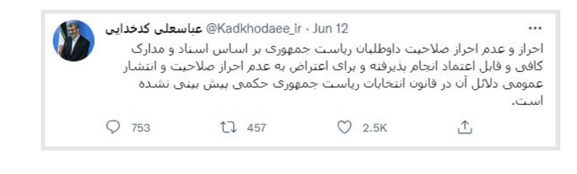 این توییت در روز ۲۲ خرداد ۱۴۰۰ منتشر شد. لاریجانی اینگونه پاسخ داد: " مطابق دستور حاکمیتی رهبرانقلاب در پی ابلاغ سیاستهای کلی انتخابات در سال ۹۵ و پیرو بند ۱۱-۲، شورای نگهبان موظف است در صورت درخواست داوطلبان انتخابات ریاست جمهوری در خصوص دلایل ردصلاحیت به آنان به صورت مکتوب دلایل خود را ارائه نمایند."