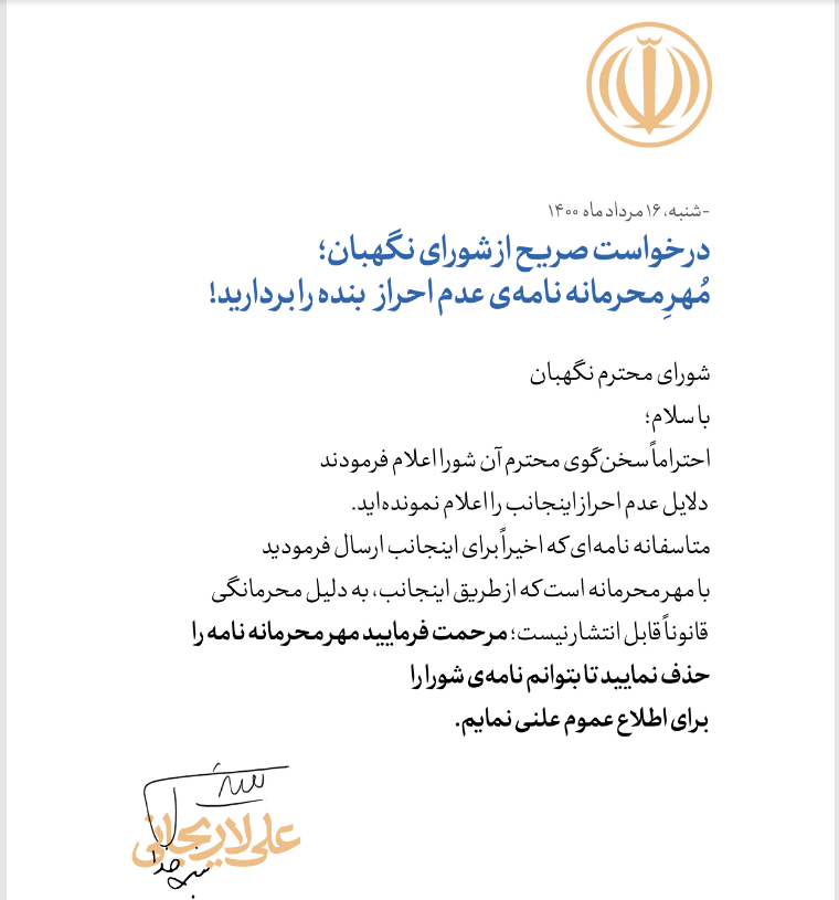 پیشتر با عدم احراز صلاحیت علی لاریجانی برای انتخابات ریاست جمهوری سال ۱۴۰۰، وی خواستار اعلام دلایل عدم احراز صلاحیت خود شده بود که در ابتدا واکنش سخنگوی وقت شورای نگهبان اینچنین بود: