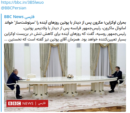 این خبری است که بی بی سی فارسی از دیدار مکرون و پوتین منتشر کرده است .از این نحوه رفتارهاست که دم خروس ادعای مضحک بی طرفی رسانهای بیرون میزند و نشان میدهد بی بی سی تا چه حد از سیاست یک بام و دو هوا تبعیت میکند. !