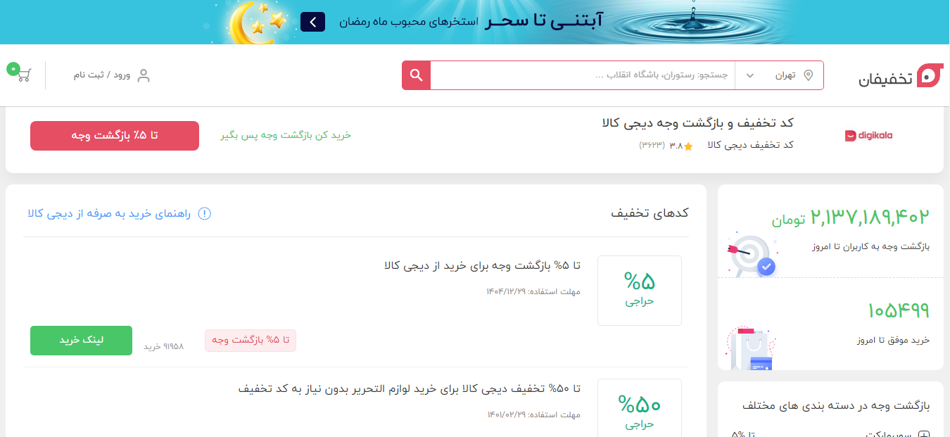با ورود به صفحه جدید، علاوه بر پیشنهادهای بازگشت وجه؛ که در ادامه آن را توضیح میدهیم؛ برخی پیشنهادهای تخفیف را مشاهده میکنید. با کلیک بر روی لینک خرید روبه روی هر پیشنهاد، به صفحه خرید با تخفیف از دیجی کالا هدایت خواهید شد