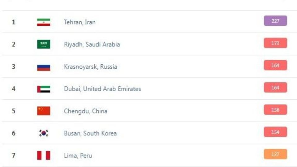 شهر کراسنویارسک در روسیه با شاخص کیفیت هوای ۱۶۴، دبی در امارات متحده با شاخص ۱۶۴ و چنگدو در چین با شاخص ۱۵۶ در رتبه های بعدی این فهرست قرار دارند.