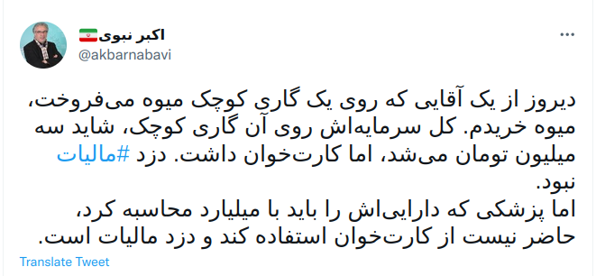 دیروز از یک آقایی که روی یک گاری کوچک میوه میفروخت، میوه خریدم. کل سرمایهاش روی آن گاری کوچک، شاید سه میلیون تومان میشد، اما کارتخوان داشت. دزد #مالیات نبود. اما پزشکی که داراییاش را باید با میلیارد محاسبه کرد، حاضر نیست از کارتخوان استفاده کند و دزد مالیات است.