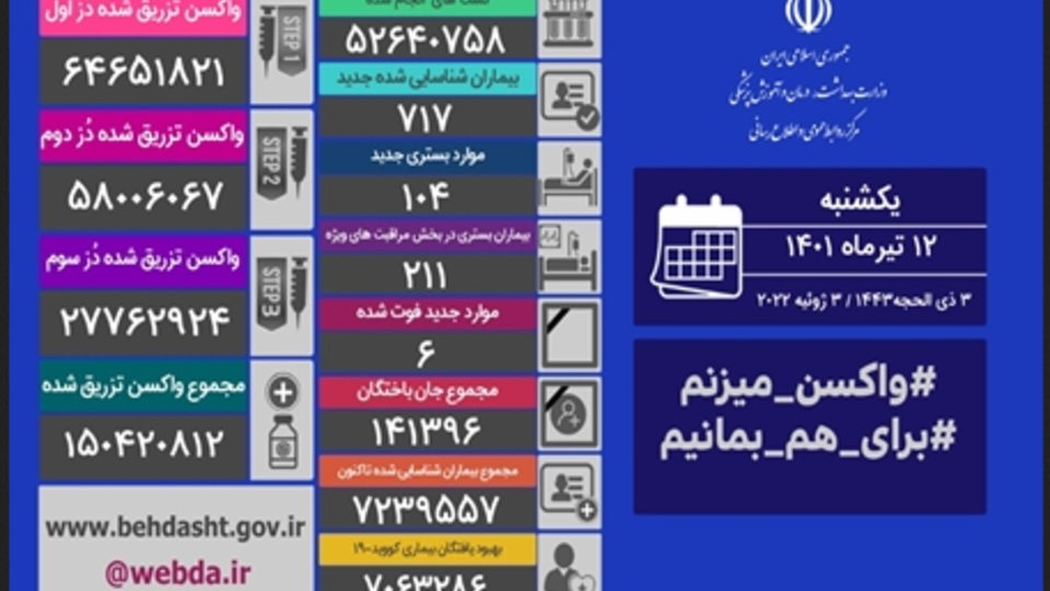 "تا کنون ۶۴ میلیون و ۶۵۱ هزار و ۸۲۱ نفر دُز اول، ۵۸ میلیون و ۶ هزار و ۶۷ نفر دُز دوم و ۲۷ میلیون و ۷۶۲ هزار و ۹۲۴ نفر، دُز سوم واکسن کرونا را تزریق کرده اند و مجموع واکسن های تزریق شده در کشور به ۱۵۰ میلیون و ۴۲۰ هزار و ۸۱۲ دُز رسید.