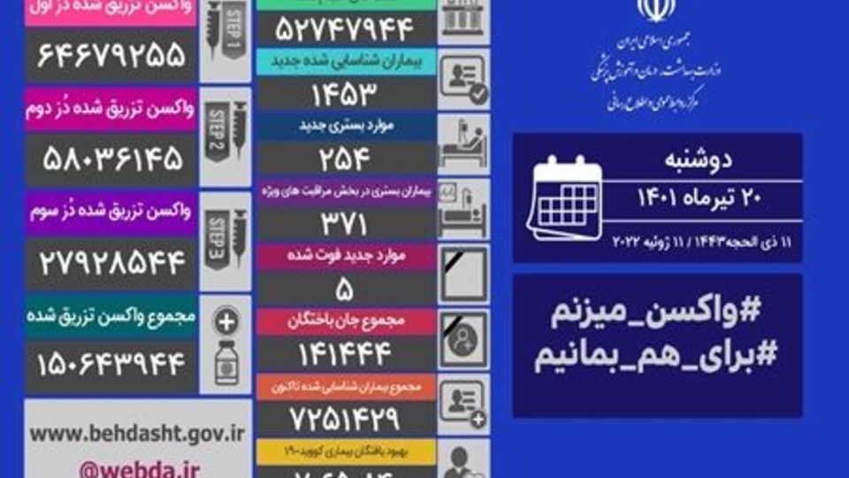 از دیروز تا امروز ۲۰ تیرماه ۱۴۰۱ و بر اساس معیارهای قطعی تشخیصی، ۱۴۵۳ بیمار جدید مبتلا به کووید۱۹ در کشور شناسایی و ۲۵۴ نفر از آنها بستری شدند.