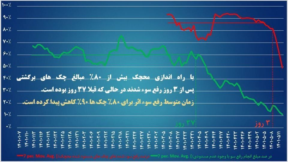 همچنین زمان متوسط رفع سوءاثر این چکها با کاهش ۹۰ درصدی از ۳۷ روز به ۳ روز کاهش پیدا کرده است.