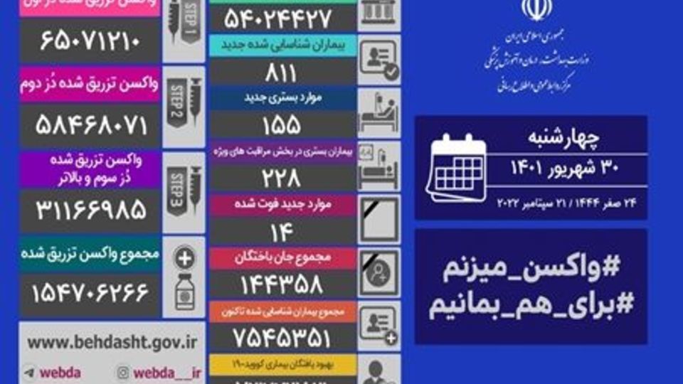 از دیروز تا امروز ۳۰ شهریورماه ۱۴۰۱ و بر اساس معیارهای قطعی تشخیصی، ۸۱۱ بیمار جدید مبتلا به کووید۱۹ در کشور شناسایی و ۱۵۵ نفر از آنها بستری شدند.