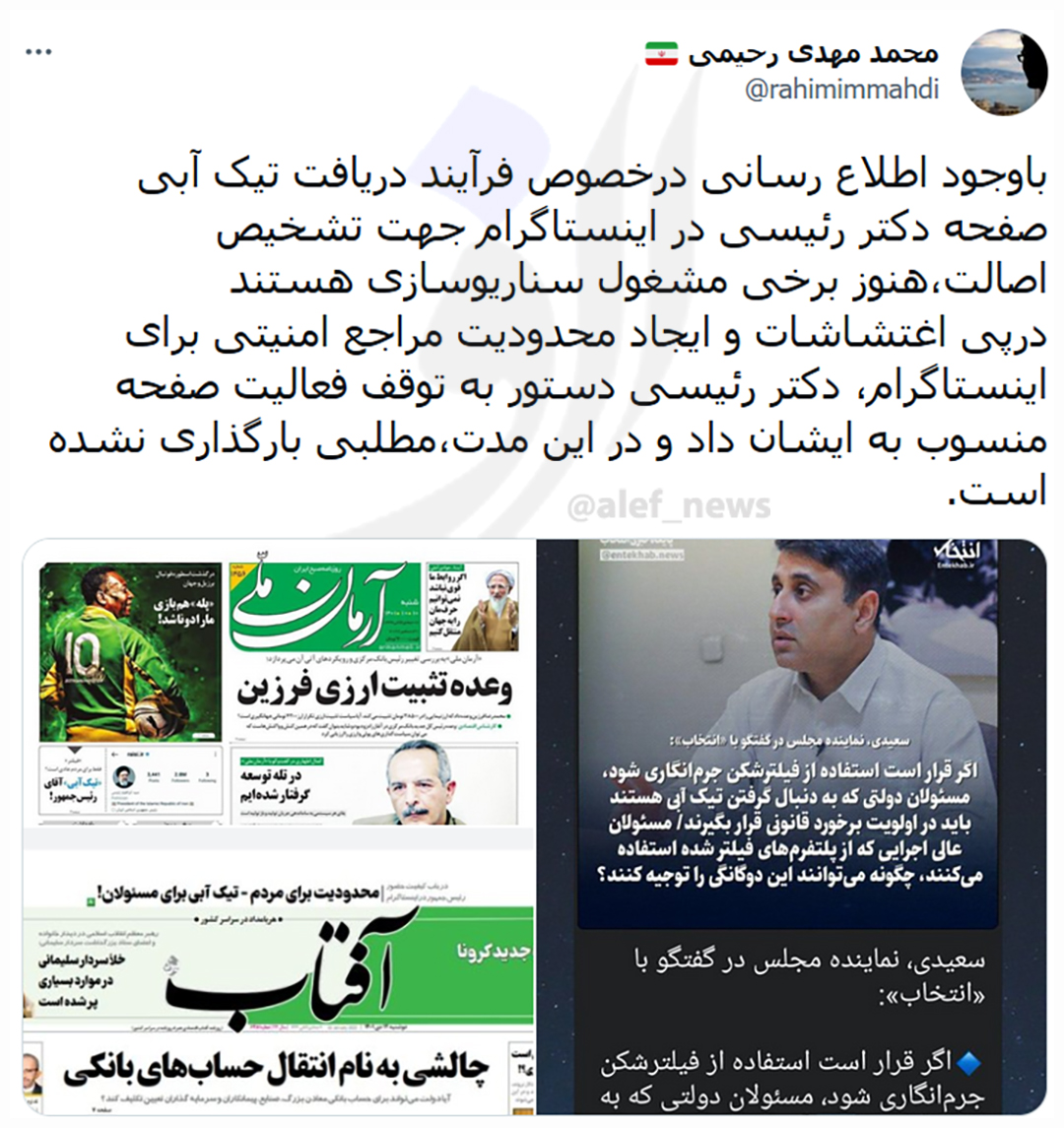 محمد مهدی رحیمی، مدیر کل روابط عمومی دفتر رئیس جمهور پنجشنبه شب در توئیتی نوشت: «باوجود اطلاعرسانی درخصوص فرآیند دریافت تیک آبی صفحه دکتر رئیسی در اینستاگرام جهت تشخیص اصالت، هنوز برخی مشغول سناریوسازی هستند. درپی اغتشاشات و ایجاد محدودیت مراجع امنیتی برای اینستاگرام، دکتر رئیسی دستور به توقف فعالیت صفحه منسوب به ایشان داد و در این مدت، مطلبی بارگذاری نشده است.»