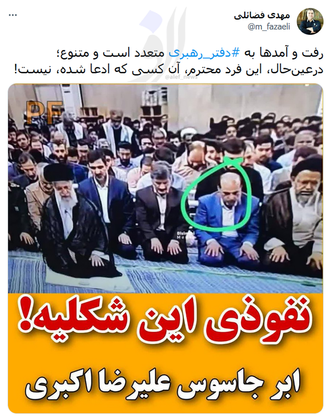 مهدی فضائلی عضو دفتر نشر آثار رهبر انقلاب به انتشار یک عکس در توییتر واکنش نشان داد و نوشت: رفتوآمدها به بیت رهبری متعدد است اما فرد در عکس، علیرضا اکبری نیست.