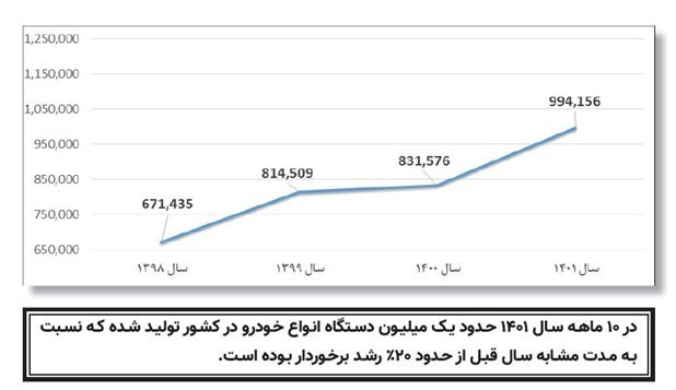 به گزارش تسنیم، بر اساس اعلام دفتر صنایع خودروی وزارت صمت، در 10 ماهه سال جاری 994156 دستگاه انواع خودرو در کشور تولید شده که نسبت به مدت مشابه سال قبل 20 درصد افزایش را نشان می دهد.