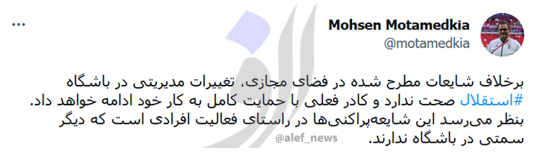 4011122074محسن معتمدکیا، مدیرکل روابط عمومی وزیر ورزش و جوانان، ضمن رد هرگونه حواشی موجود درباره تغییرات مدیریتی باشگاه استقلال، در حساب توئیتری خود نوشت: برخلاف شایعات مطرح شده در فضای مجازی تغییرات مدیریتی در باشگاه استقلال صحت ندارد و کادر فعلی با حمایت کامل به کار خود ادامه خواهد داد. به نظر میرسد این شایعهپراکنیها در راستای فعالیت افرادی است که دیگر سمتی در باشگاه ندارند.