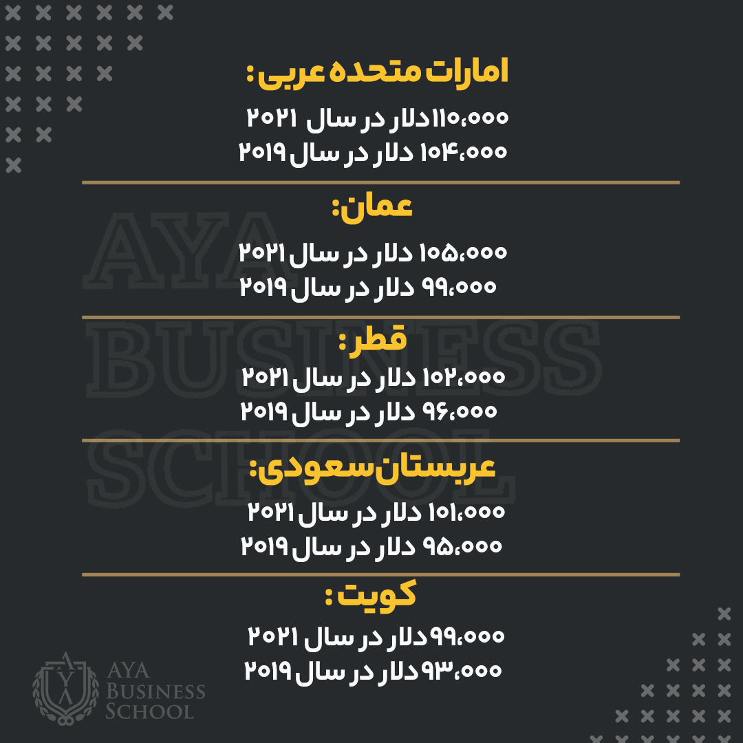 همچنین براساس گزارشی که توسط سایت Gulf Talent در سال 2021 منتشر شده است، میانگین حقوق سالانه فارغ التحصیلان MBA در کشورهای خاورمیانه به شرح زیر بوده است.
