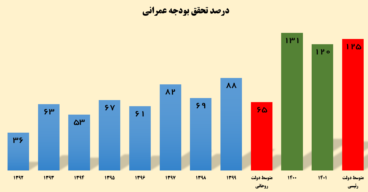 در سال ۱۴۰۰ مجموعا ۱۳۱ درصد بودجه عمرانی مصوب محقق شد یعنی دولت نه تنها کل بودجه مصوب را پرداخت کرد بلکه ۳۱ درصد هم اعتبار بیشتری برای پرداختهای عمرانی اختصاص داد.