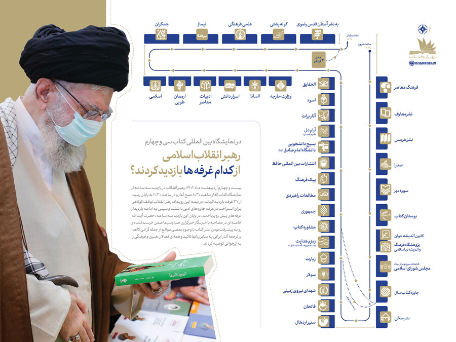 به گزارش ایرنا، این بازدید از ساعت ۸:۳۰ صبح آغاز و در ساعت ۱۱:۳۰ به پایان رسید. در نیمه این رویداد، رهبر انقلاب توقف کوتاهی برای استراحت در غرفه جایزههای ادبی داشتند و سپس به ادامه بازدید از غرفههای پیشرو پرداختند.