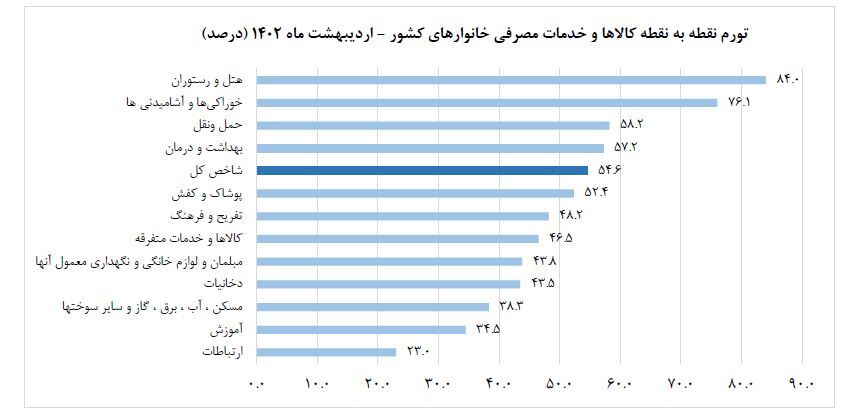 در این گزارش بیان شده تورم نقطه به نقطه اردیبشهت نسبت به ما قبل ٠،٩ درصد کاهش یافته است. منظور از تورم نقطه به نقطه، درصد تغییر عدد شاخص قیمت نسبت به ماه مشابه سال قبل میباشد. در اردیبهشت ماه ١٤٠٢ تورم نقطه به نقطه خانوارهای کشور، ٥٤،٦ درصد بوده ؛ یعنی خانوارهای کشور به طور میانگین، ٥٤.٦ درصد بیشتر از اردیبهشت ماه ١٤٠١ برای خرید یک «مجموعه کالاها و خدمات یکسان» هزینه کردهاند.