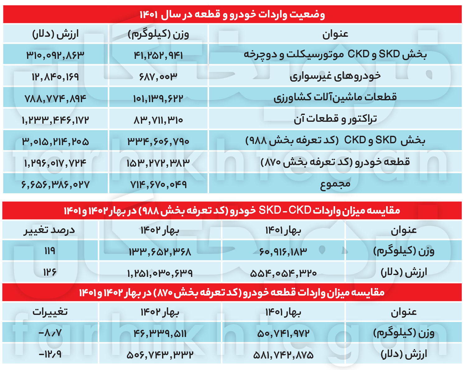 یکی از مشکلات حوزه خودرو، فقدان آمارهای قابل اتکا و به تفکیک بخشهای مختلف شامل خودروسازی و قطعهسازی است. جستوجویهای «فرهیختگان» از کد تعرفههای مختلف در دادههای گمرک ایران نشان میدهد در سال 1401 مجموع واردات بخش خودرو، موتورسیکلت و ماشینآلات کشاورزی (کمباین و تراکتور) درمجموع 6 میلیارد و 656 میلیون دلار بوده است. ذکر این نکته الزامی است که این ارقام مربوط به کد تعرفههایی است که سالهای قبل با عنوان واردات/صادرات بخش خودرو بهعلاوه کد تعرفههای با عنوان قطعات منفصله (کد تعرفههای 988) منتشر میشد و چند سالی است که آمارهای حوزه خودرو و قطعه به تفصیل و با جزئیات و به تفکیک منتشر نمیشود. آمار و ارقام استخراجشده حکایت از آن دارد که طی سال 1401 از مجموع بیش از 6.6 میلیارد دلار واردات قطعه (قطعه خرد و قطعه به صورتSKD و CKD) حدود 3 میلیارد و 15 میلیون دلار مربوط به بخش خودرو (شامل واردات خودروسازان بخش خصوصی و ایرانخودرو و سایپا)، یک میلیارد و 296 میلیون دلار به صورت قطعه خودرو، یک میلیارد و 233 میلیون دلار قطعه تراکتور و کمباین، 788 میلیون دلار قطعات سایر ماشینآلات کشاورزی، حدود 310 میلیون دلار واردات SKD و CKD موتورسیکلت و دوچرخ و 12.8 میلیون نیز مربوط به خودروهای غیرسواری بوده است.