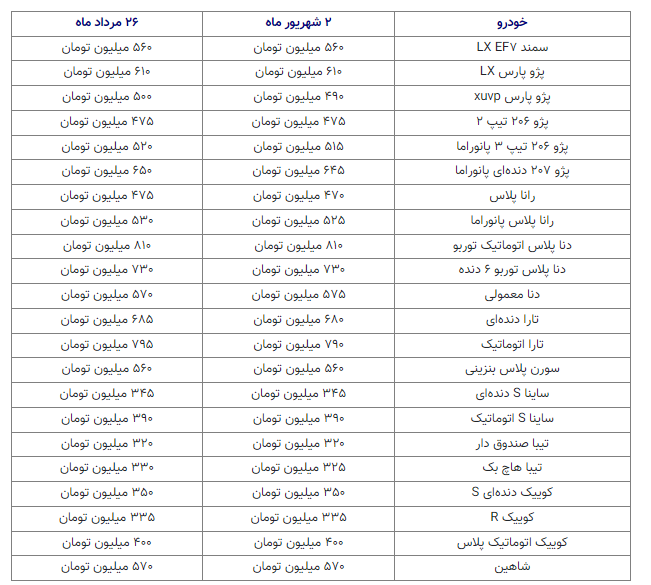 در جدول زیر قیمت خودروهای پرتیراژ داخلی نسبت به ۲۶ مرداد ماه آمده است.