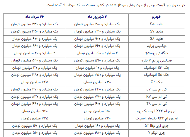 در جدول زیر قیمت برخی از خودروهای مونتاژ شده در کشور نسبت به ۲۶ مردادماه آمده است.