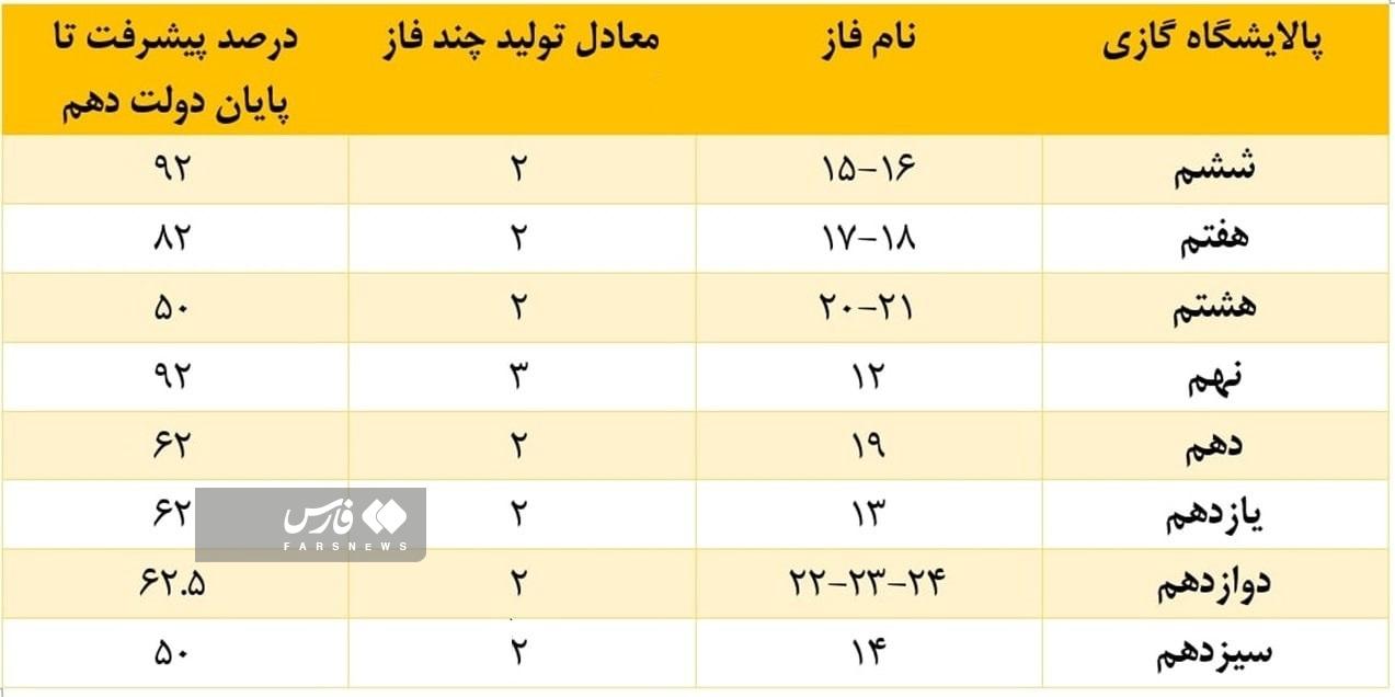 در جدول 1، جزئیات پیشرفت هر فاز پارس جنوبی در پایان دولت دهم آورده شده است. همانطور که مشاهده میکنید فازهای پارس جنوبی با درصد پیشرفتهای بالا تحویل دولت یازدهم شدهاند و حتی معادل 5 فاز با پیشرفت بیش از 90 درصد در اختیار دولت یازدهم و دوازدهم قرار گرفت.