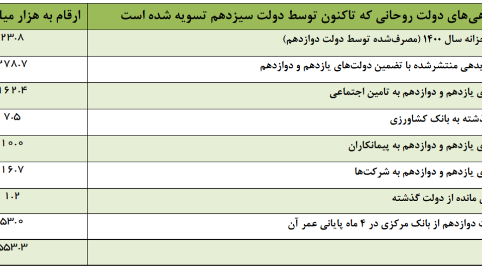 جدول زیر شامل بدهیهای ریالی است که از دولت گذشته به جامانده بود و تاکنون توسط دولت سیزدهم تسویه شده است. بدهیهای ارزی دولت گذشته در این جدول نیامده است.