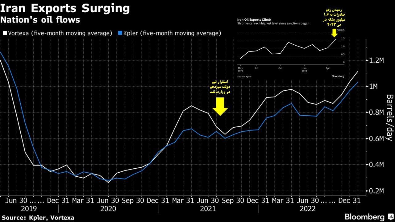 طبق آخرین گزارش موسسه کپلر و ورتکسا، میزان صادرات نفت ایران در ابتدای دولت سیزدهم حدود ۶۰۰ الی ۷۰۰ هزار بشکه در روز بوده است و این عدد در ماه می سال ۲۰۲۳ به ۱.۶ میلیون بشکه در روز افزایش یافته است.