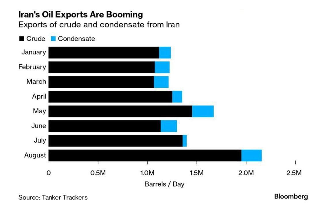 طبق آمار تانکر ترکرز نیز صادرات نفت و میعانات گازی ایران در 20 روز ابتدای ماه گذشته میلادی به 2.2 میلیون بشکه در روز افزایش یافته است. البته تانکر ترکرز در پایان ماه آگوست (تصویر 3) رقم صادرات نفت ایران در این ماه را بیش از 1.85 میلیون بشکه در روز اعلام کرد.