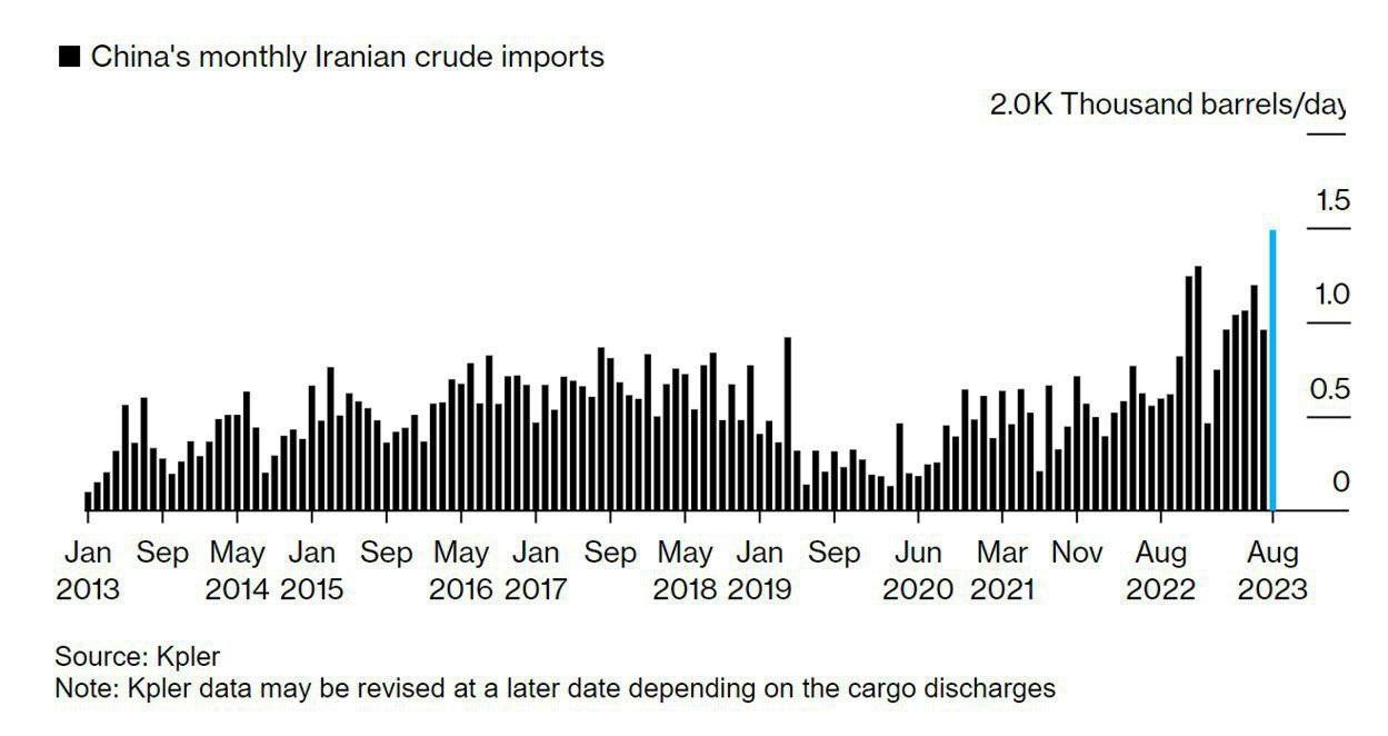 افزایش رقم نقطهای و میانگین صادرات نفت ایران به خوبی در آمار میزان فروش نفت به چین به عنوان بزرگترین واردکننده نفت جهان نیز مشخص است. بلومبرگ با انتشار نموداری از موسسه کپلر (تصویر 4) نوشت ایران امسال صادرات نفت خود را افزایش داده زیرا از نظر ژئوپلیتیکی قویتر شده است و بیشتر محمولهها به چین میروند. طبق آمار کپلر، بزرگترین واردکننده نفت جهان در ماه گذشته حدود ۱.۵ میلیون بشکه در روز نفت خام از ایران وارد کرده است.
