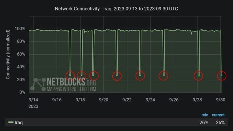 طبق برنامه وزارت آموزش و پرورش عراق قرار بود که این قطعی اینترنت از ۱۸ سپتامبر تا ۲۹ سپتامبر (جمعه) و از ساعت چهار صبح تا هشت صبح به وقت محلی صورت بگیرد؛ اما تعویق چند امتحان باعث ادامه یافتن آن تا به امروز (شنبه) شد.
