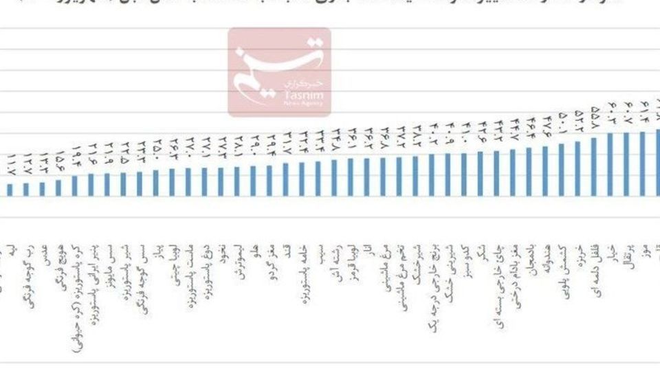 به گزارش تسنیم، طبق گزارش جدید مرکز آمار ایران از نرخ رشد قیمت 53 ماده غذایی در ایران در شهریور امسال نسبت به مدت مشابه سال گذشته در نقاط شهری، تعداد 21 قلم کالا رشد قیمت بالاتری از نرخ تورم نقطه ای نقاط شهری که 39.6 درصد بوده است، داشته اند.