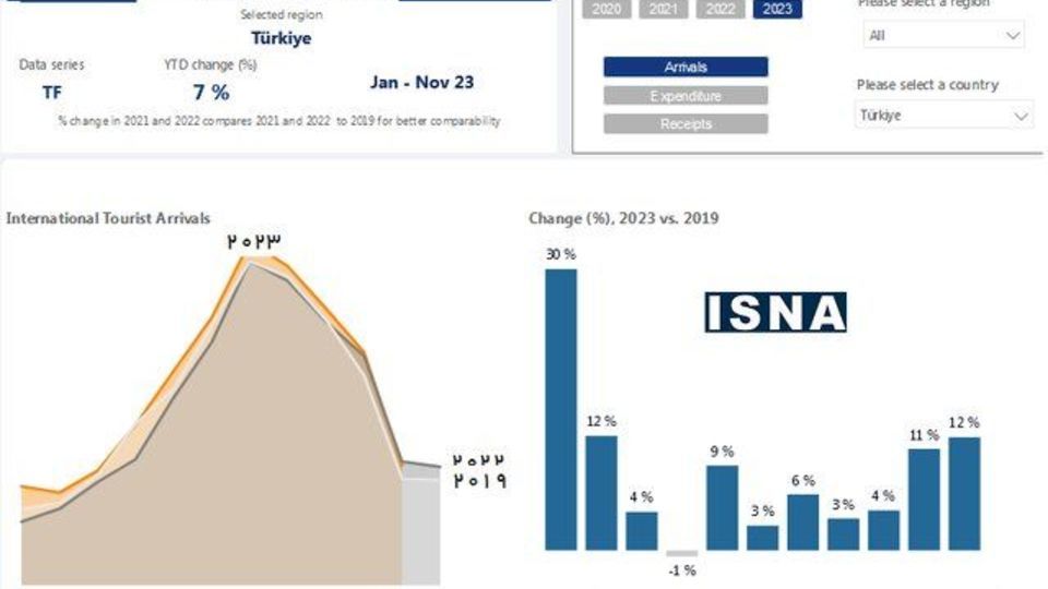 ترکیه برای ایرانیها نیز همچنان یک مقصد محبوب محسوب میشود و از ژانویه تا نوامبر پذیرای ۲.۹ میلیون بازدیدکننده ایرانی بوده که نسبت به مدت مشابه سال ۲۰۲۲ افزایش ۵ درصدی را نشان میدهد.