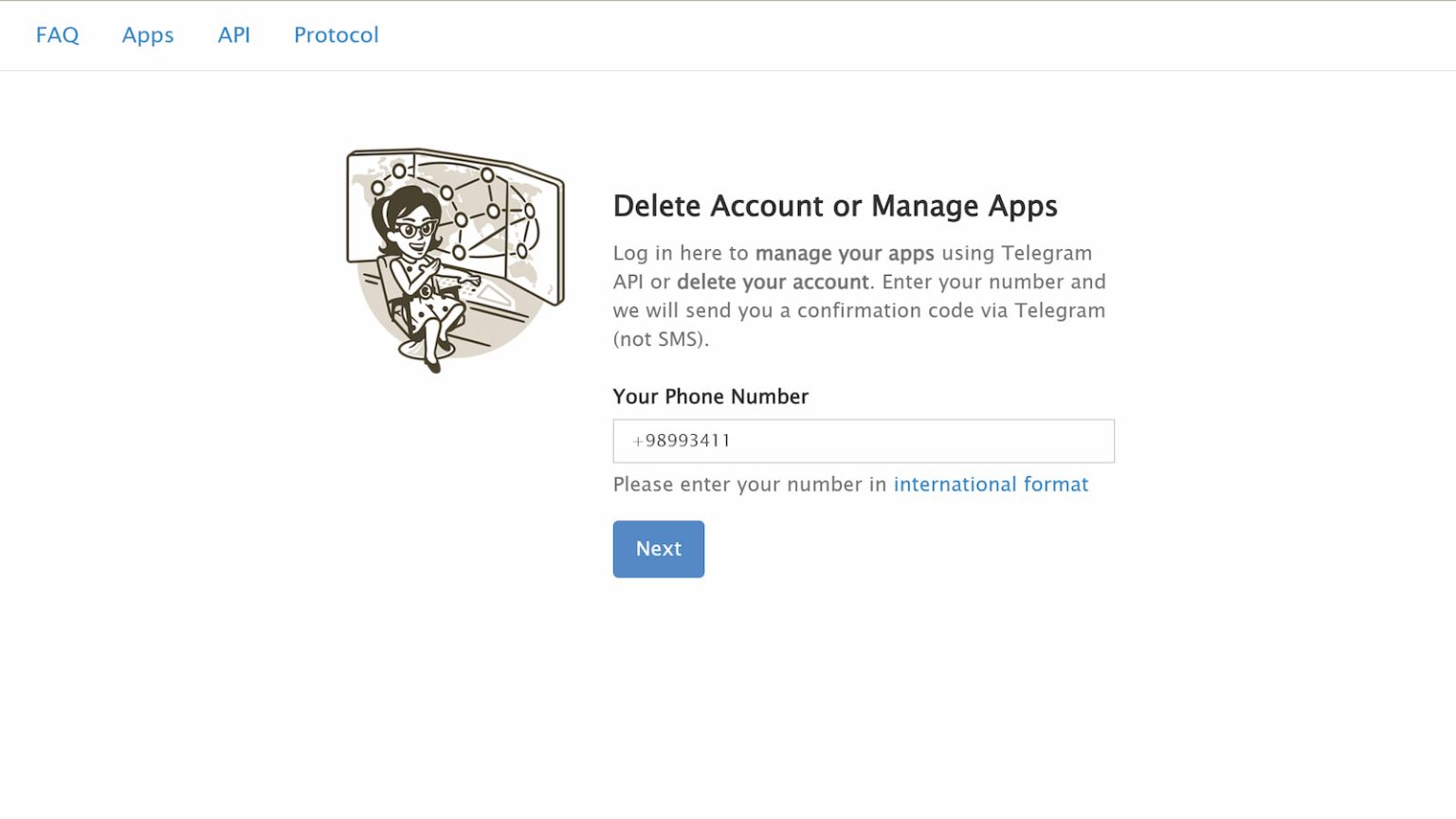 - وارد لینک مستقیم دیلیت اکانت تلگرام شوید.