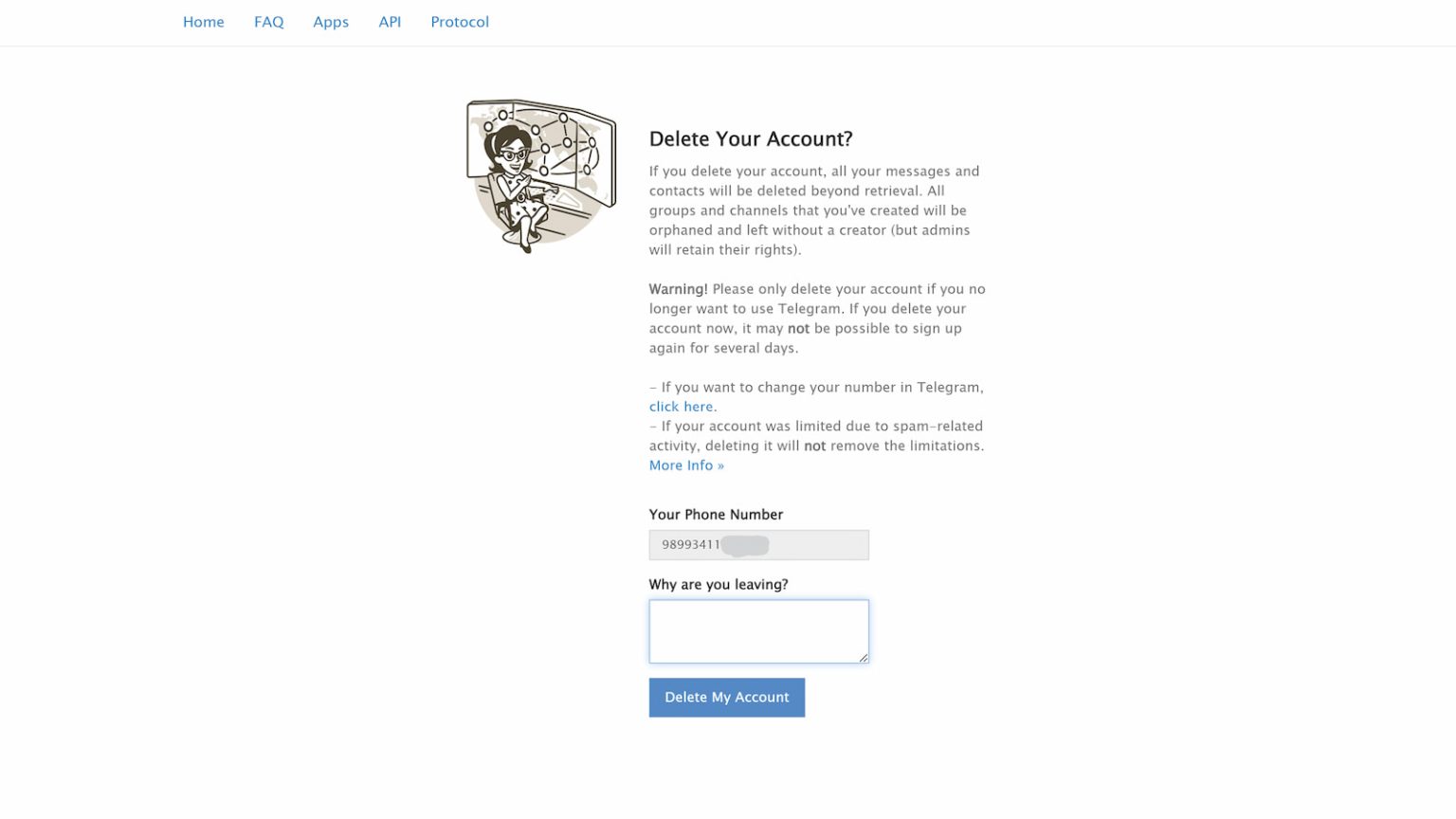 در باکس Why are you leaving دلیل تلگرام دیلیت اکانت را وارد کرده و بعد به روی Delete My Account کلیک کنید (نیازی نیست حتما دلیلی بنویسید).