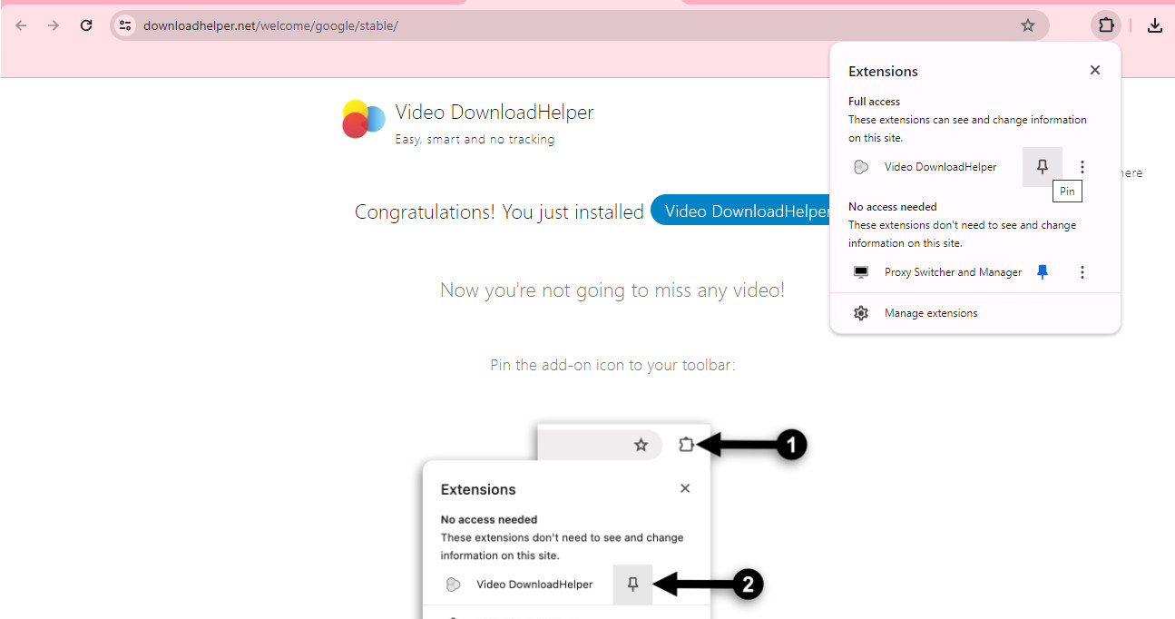۶. حالا روی اکستنشن روی بالا سمت راست کلیک کنید و اکستنشن Video DownloadHelper را پین کنید.