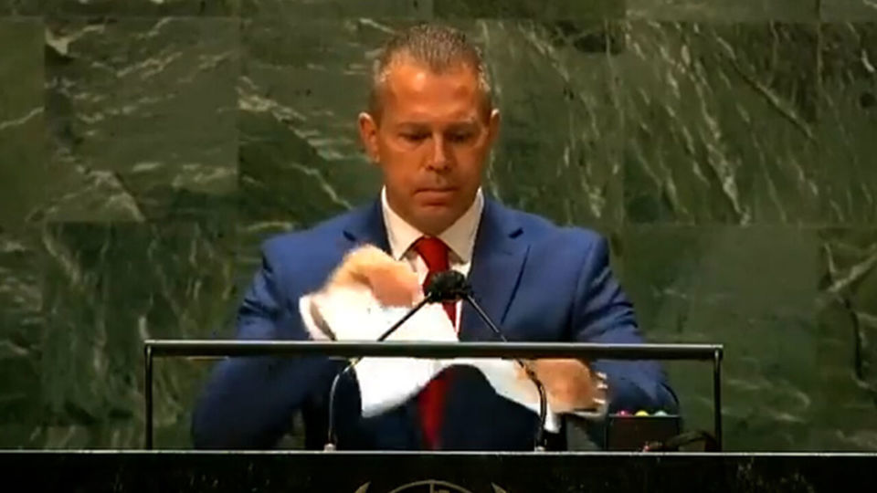 وی حماس را به جنایت علیه بشریت متهم کرد و افزود که این گروه "با سوء استفاده از انفعال شورای امنیت، به پنهان کردن فرماندهان خود در میان غیرنظامیان و مواضع نظامی خود در مدارس نهاد سازمان ملل موسوم به آنروا ادامه می دهد. "
