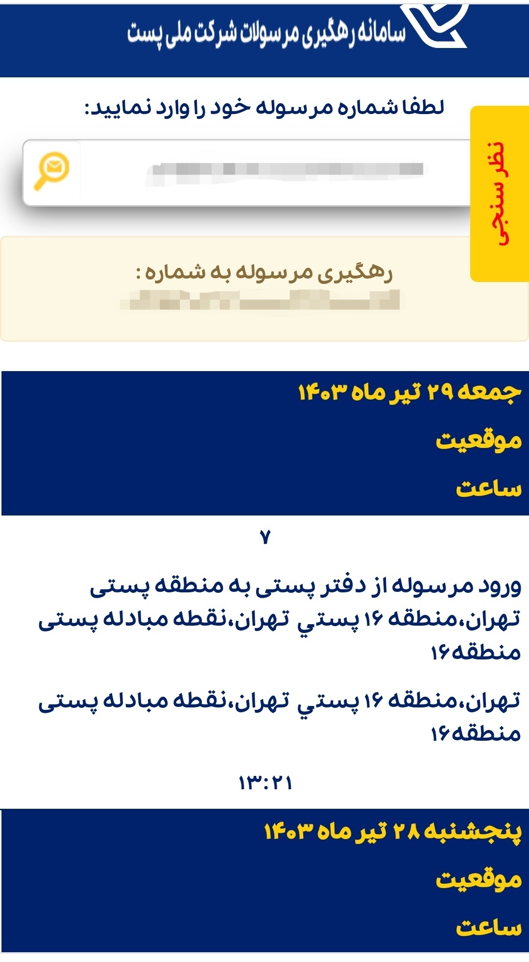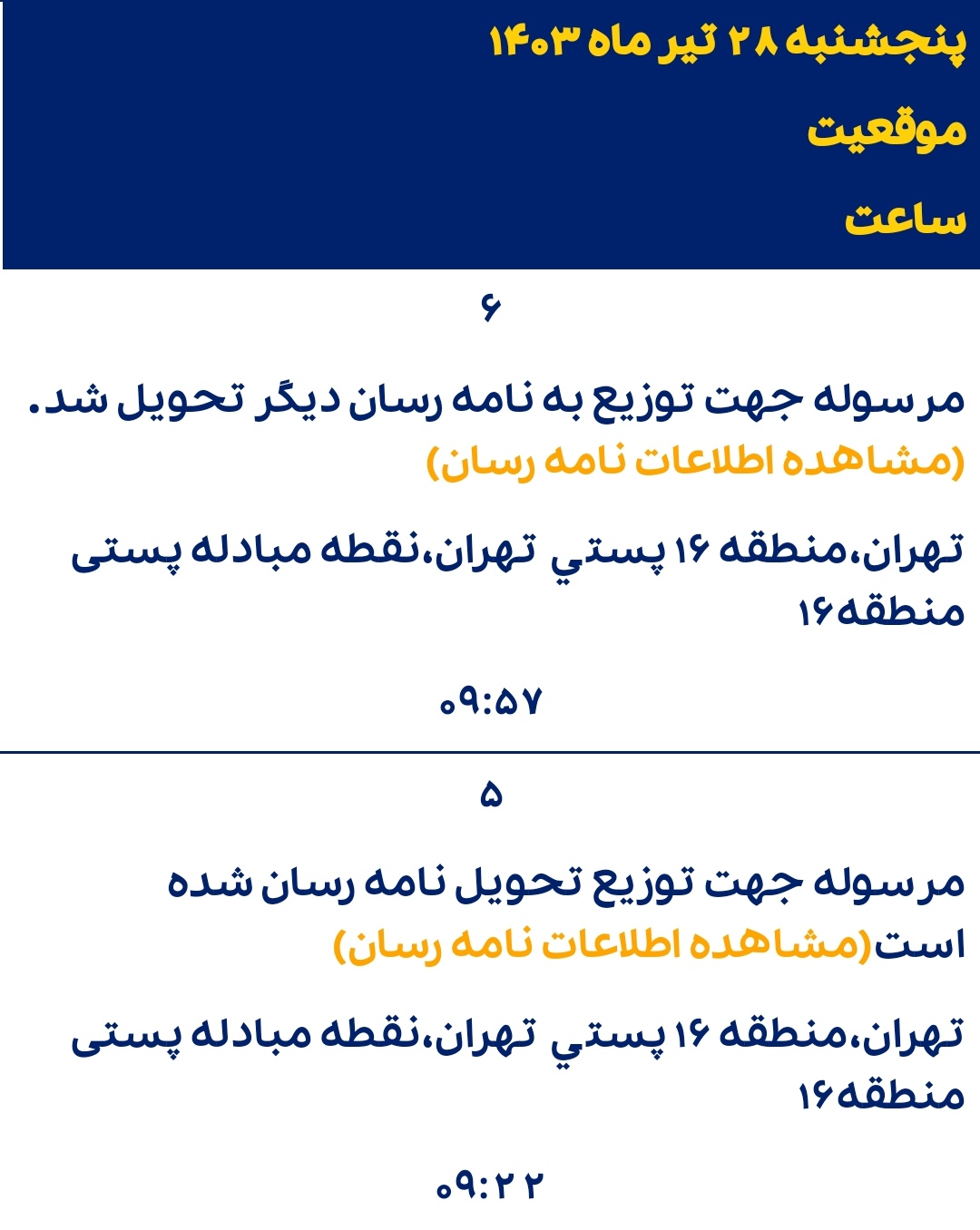 روز چهارشنبه ۲۷ تیرماه ۱۴۰۳ یک مرسوله از یکی از شهرک های اطراف تهران به مقصد نارمک پست می شود. به گفته فرستنده، این بسته به روال معمول باید فردا تا ظهر به دست گیرنده برسد. رهگیری مرسوله نیز نشان می دهد بسته یادشده روز پنجشنبه وارد پست منطقه ۱۶ تهران شده و به نامه رسان منطقه تحویل شده. اما گیرنده تا امروز ، سه شنبه 2 مردادماه آن را دریافت نکرده است!