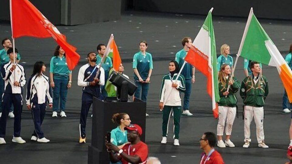 ورزشکار ایران با گرمکن سفید و سبز در مراسم رژه اختتامیه حضور داشت.