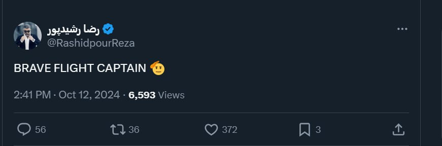 به گزارش ایسنا، رضا رشیدپور مجری تلویزیون به این پرواز واکنش نشان داد و در توئیتر نوشت: