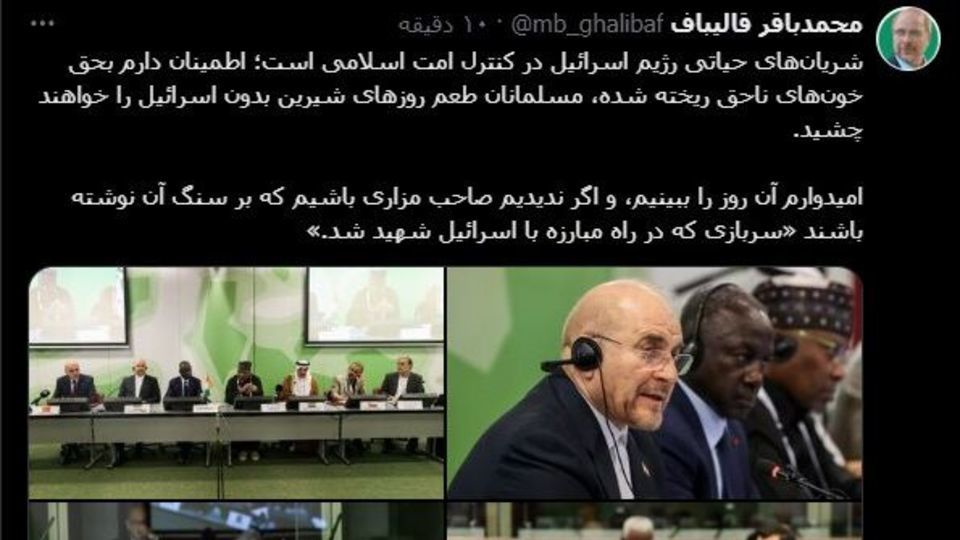 به گزارش ایرنا، محمد باقر قالیباف روز یکشنبه 22 مهر 1403 در شبکه اجتماعی ایکس نوشت: شریانهای حیاتی رژیم اسرائیل در کنترل امت اسلامی است؛ اطمینان دارم بحق خونهای ناحق ریخته شده، مسلمانان طعم روزهای شیرین بدون اسرائیل را خواهند چشید.