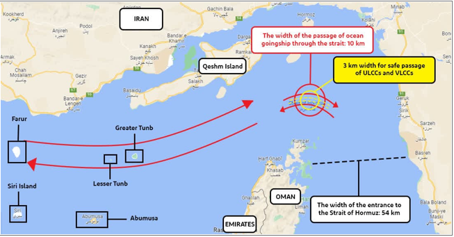 عرض ورودي تنگه هرمز مطابق شکل برابر 54 کيلومتر و کمترين عرض آن 39 کيلومتر (21 مايل دريايي) است که بدليل محدوديت عمق آب تنها منطقه اي به عرض 10 کيلومتر آن قابل عبور براي کشتيراني است و تنها 3 کيلومتر آن براي عبور کشتي هاي غول پيکر (مسير رفت و برگشت) مناسب است که البته از اطراف جزاير ايراني بايد عبور کنند که بر روي اين جزاير هم نصب پايگاه¬هاي موشکي محتمل است. بيشترين عمق آب در عرض 3 کيلومتري فوق (براي کشتيراني) برابر 100 متر است و هرچه به سمت داخل خليج فارس مي رود اين عمق کاهش مي يابد و تا 60 متر در اين کانال مي رسد.