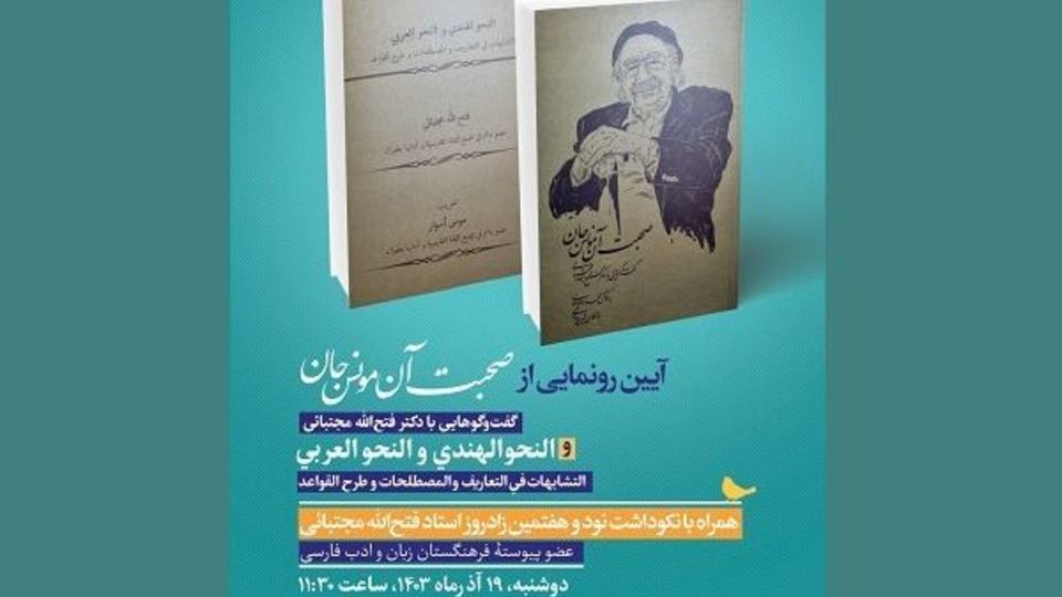 به گزارش الف کتاب، به نقل از مهر، آئین رونمایی از کتابهای «صحبت آن مونس جان» و «النحو الهندی و النحو العربی» دوشنبه این هفته ۱۹ آذرتوسط فرهنگستان زبان و ادب فارسی برگزار میشود.
