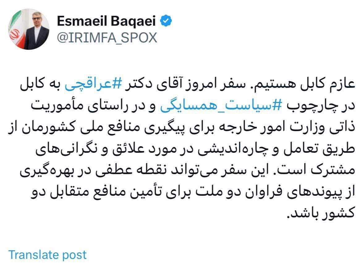 بقایی نوشت: عازم کابل هستیم. سفر امروز آقای دکتر عراقچی به کابل در چارچوب سیاست همسایگی و در راستای مأموریت ذاتی وزارت امور خارجه برای پیگیری منافع ملی کشورمان از طریق تعامل و چارهاندیشی در مورد علائق و نگرانیهای مشترک است.