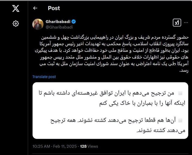 به گزارش ایسنا، کاظم غریبآبادی در پیامی در شبکه ایکس نوشت: حضور گسترده مردم شریف و بزرگ ایران در راهپیمایی بزرگداشت چهل و ششمین سالگرد پیروزی انقلاب اسلامی، پاسخ محکمی به تهدیدات اخیر رئیس جمهور آمریکا بود.وی در ادامه نوشت: ایران بطور قاطع از امنیت و منافع ملی خود حفاظت خواهد کرد.با هدف پیگیریهای حقوقی نیز اظهارات خلاف حقوق بینالملل و منشور ملل متحد رییس جمهور آمریکا طی یک نامه اعتراضی به عنوان سند شورای امنیت سازمان ملل به ثبت میرسد.