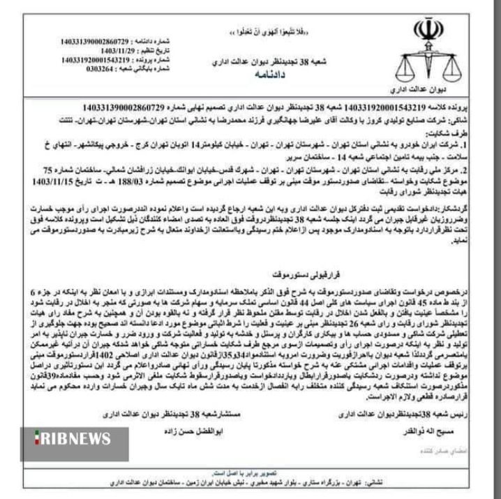 به گزارش الف به نقل از خبرگزاری صدا و سیما؛ دیوان عدالت اداری در حکمی دستور قرار قبولی موقت دادنامه کروز را صادر کرد و حکم هیئت تجدیدنظر شورای رقابت مبنی بر غیرقانونی بودن حضور این شرکت قطعه ساز در هیئت مدیره ایران خودرو را تا بررسی نهایی متوقف کرد.