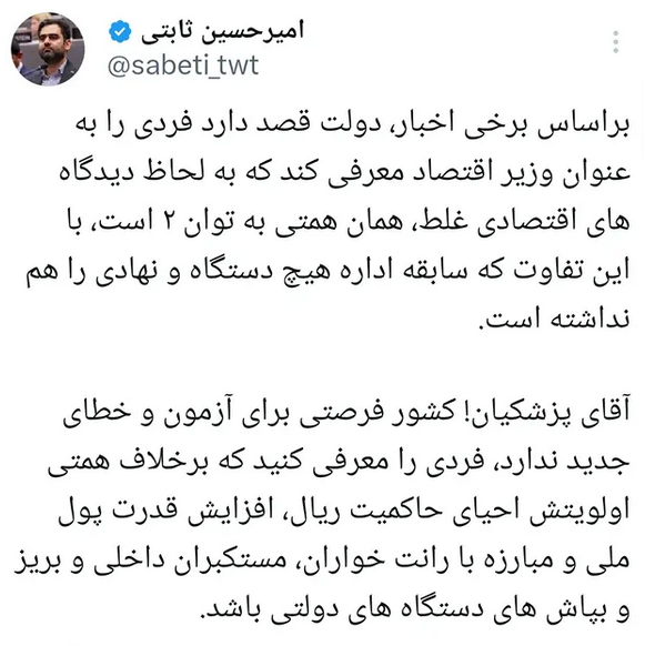 امیرحسین ثابتی نماینده مجلس شورای اسلامی در شبکه اجتماعی ایکس در مورد انتخاب وزیر اقتصاد نوشت: