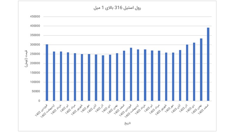 - افزایش در 1403: قیمت ورق 316 تا اسفند ۱۴۰۳ به ۳۹۰,۹۰۰ تومان صعود کرد. این رشد همسو با تحولات بازار فولاد زنگ نزن در آسیا و اروپا بوده است.