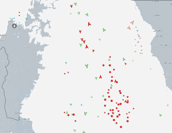 سرفلشهای قرمز رنگ نشاندهنده نفتکشها و نقاط قرمز رنگ نشان دهنده نفتکشهای متوقف شده در مختصات پیش از ورود به تنگه هرمز هستند