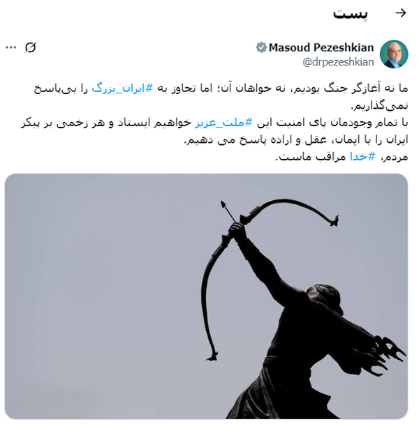 به گزارش فارس، رئیس جمهوری اسلامی ایران در مطلبی در صفحه شخصی خود در توییتر نوشت: ما نه آغازگر جنگ بودیم، نه خواهان آن؛ اما تجاوز به ایران بزرگ را بیپاسخ نمیگذاریم.وی افزود: با تمام وجودمان پای امنیت این ملت عزیز خواهیم ایستاد و هر زخمی بر پیکر ایران را با ایمان، عقل و اراده پاسخ می دهیم.مردم، خدا مراقب ماست.